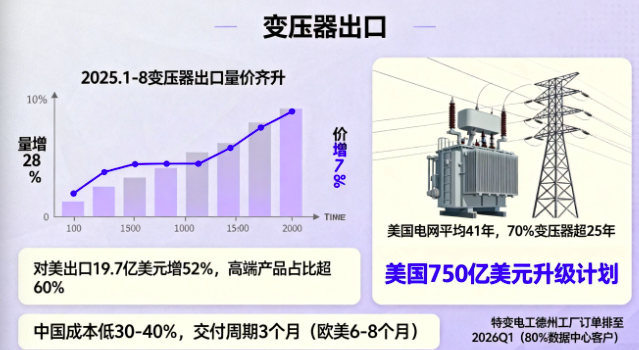 海关总署数据显示,2025年1至8月变压器出口额达53.38亿美元,同比激增38%,其中北美市场贡献了近40%的增量。这种"国内AI算力中心建设+海外能源基建复苏"的双轮驱动,正在重塑电网设备行业的估值逻辑。