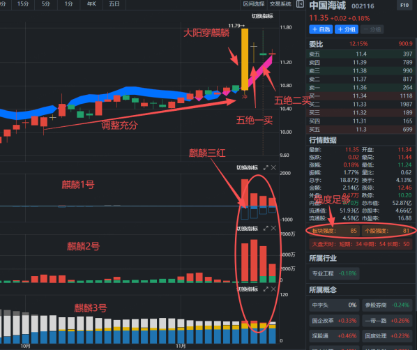 先看看这只股的麒麟趋势走势:经过一段时间充分调整后,11 月 12 日股价涨停冲破麒麟线,趋势线转红,麒麟 1 号、2 号、3 号都是红柱,也就是 “麒麟三红”,资金验证过关;11 月 13 日还是麒麟三红,板块强度和个股强度都超 80 分。低位反转 + 大阳穿麒麟线 + 麒麟三红 + 强度超 80,完全符合五绝一买的介入信号。