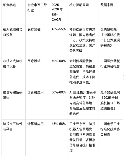 未来3-5年,脑机接口作为生命科学与信息科学融合的前沿赛道,正处于从临床试点向规模化应用过渡的关键期,整体年均复合增长率预计达40%-50%。其中申万二级行业医疗器械(含植入式/非植入式设备)CAGR 42%-52%,计算机应用(含编解码算法、交互软件)CAGR 45%-55%。