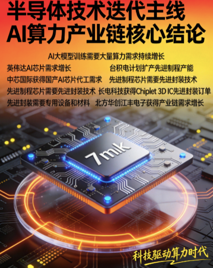 AI大模型训练需要大量算力 → 英伟达等AI芯片厂商订单增长 → 台积电等晶圆厂扩产先进制程产能 → 中芯国际等国内晶圆厂获得国产AI芯片代工相关需求机遇 → 先进制程芯片需要先进封装技术 → 长电科技等封测厂商获得Chiplet、3D IC等先进封装订单相关机遇 → 先进封装需要专用设备和材料 → 北方华创、江丰电子等企业获得产业链需求增长相关机遇