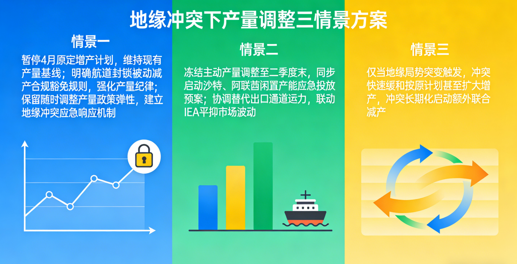 情景一:暂停原定 4 月增产计划,维持现有产量基线;明确航道封锁导致的被动减产合规豁免规则,强化产量纪律;保留随时调整产量的全量政策弹性,建立地缘冲突应急响应机制。